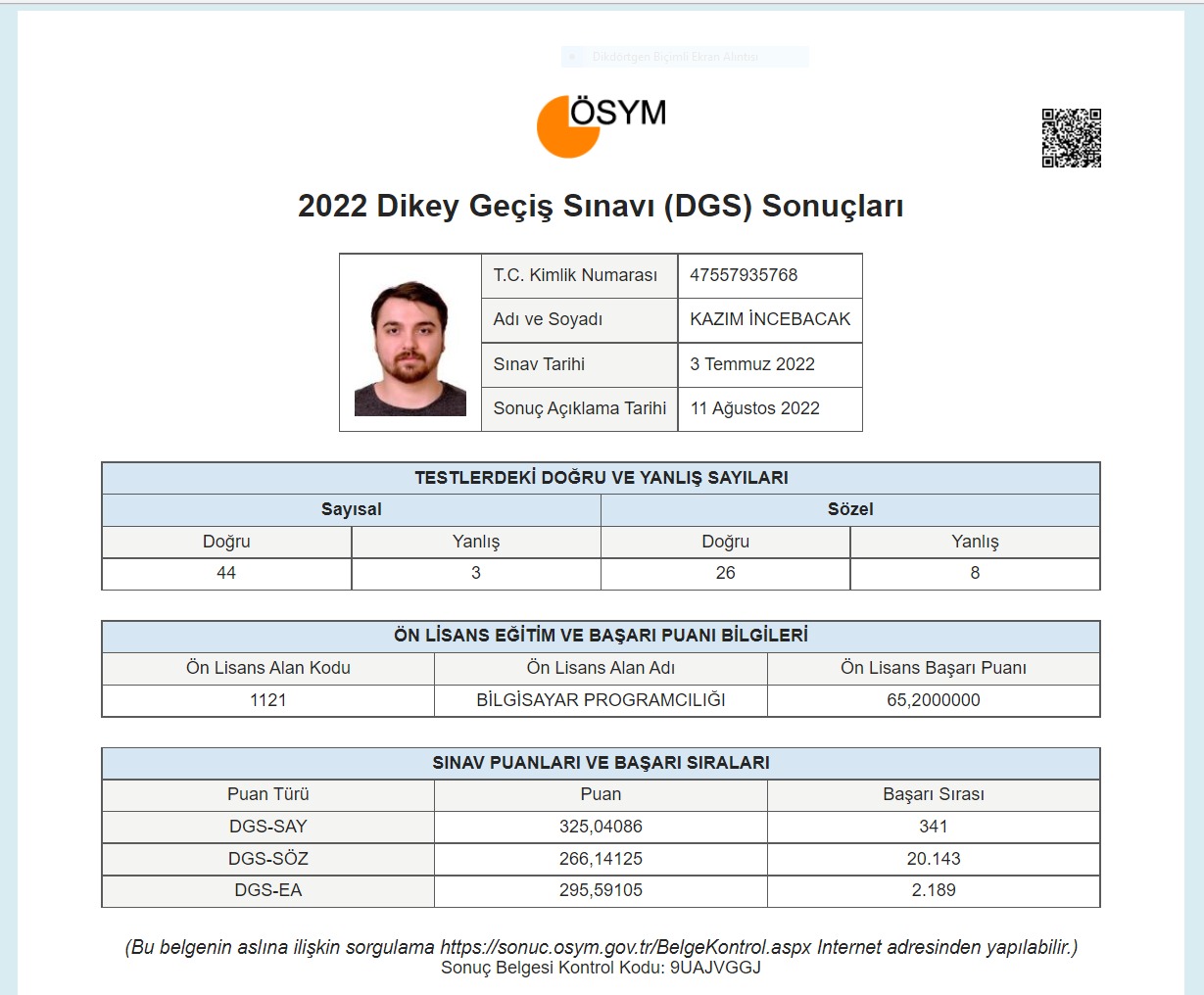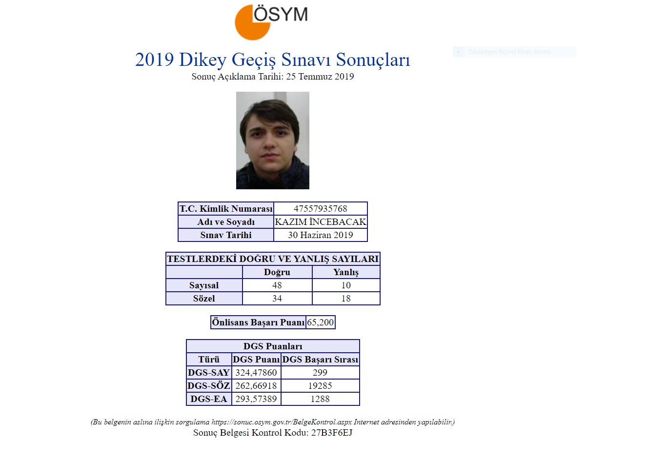 2018'de Bilgisayar Programcılığı'ndan mezun oldum. Lisans tamamlamak için kendimi DGS'ye verdim. Bir yıl boyunca disiplinli ve stratejik çalıştım. Sonuç: 2019 DGS Sayısal Türkiye 299.'su. 60 soru sayısalda 48 doğru, sadece 10 yanlış.